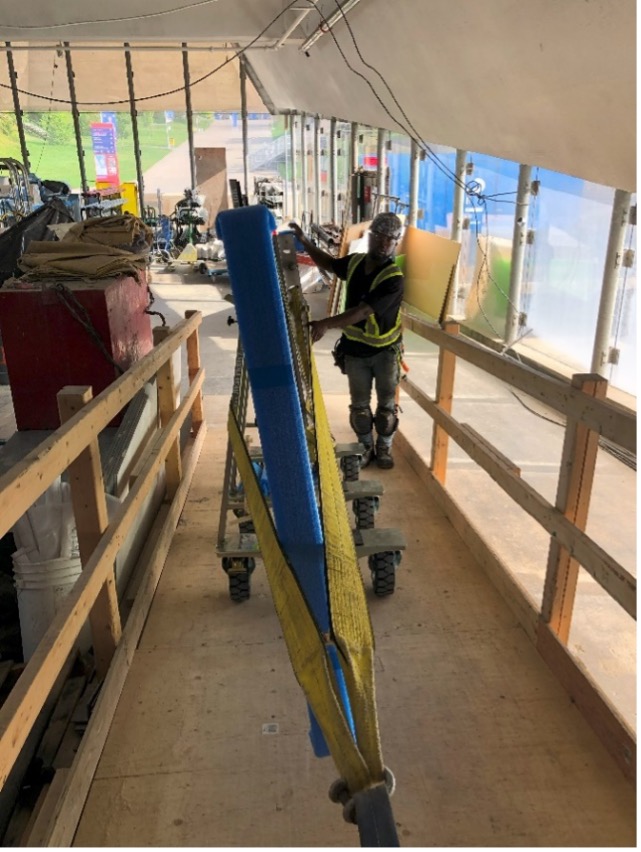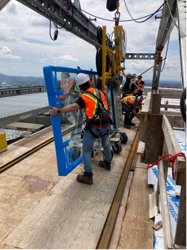Først ble glassrutene fraktet opp i tårnet i trekasser i den skrå heisen. Montørene brukte et VSG 1000 KMH sugesystem til å fjerne de tunge glasselementene og plassere dem på Heavydrives transportvogn for glass.